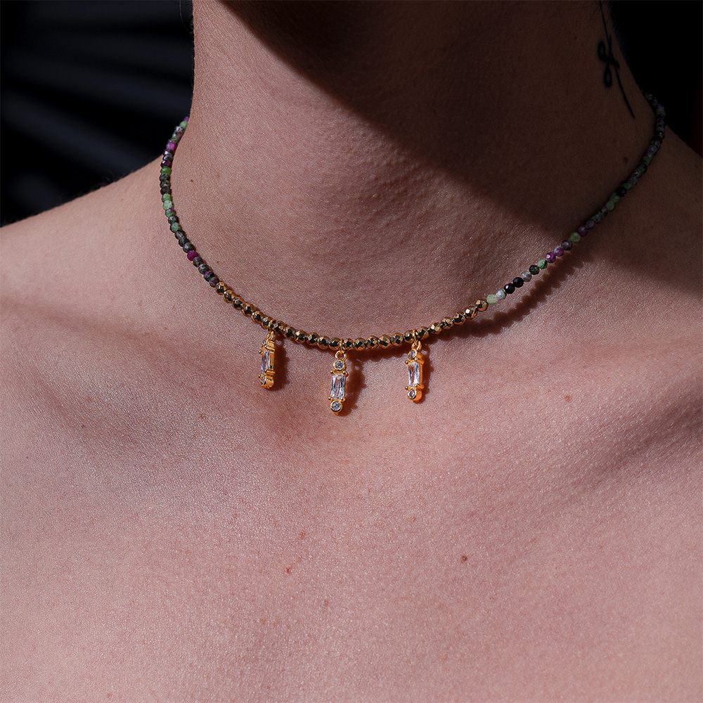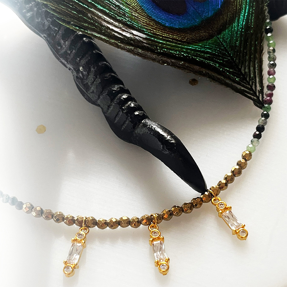 Elégance et enchantement pour cette interprétation de Calliope, la belle poétesse. Composée d'un rang d'épidotes naturelles surmonté de trois pendentifs en zircons blancs et hématites dorées.