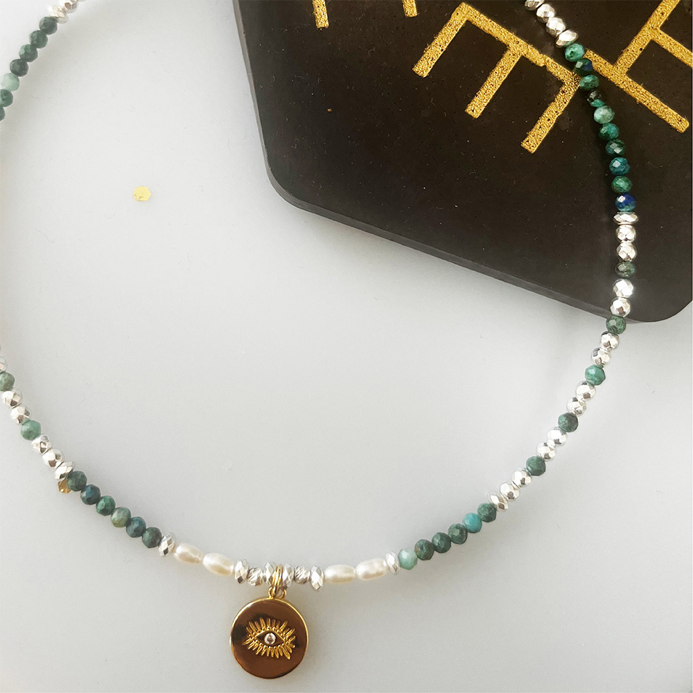 Eblouissante alliance d'un médaillon portant le symbole de protection, perles en chrysocolle naturelle, perles d'eau douce, hématites argentées et perles en argent 925 pour célébrer Circé, la très puissante magicienne.