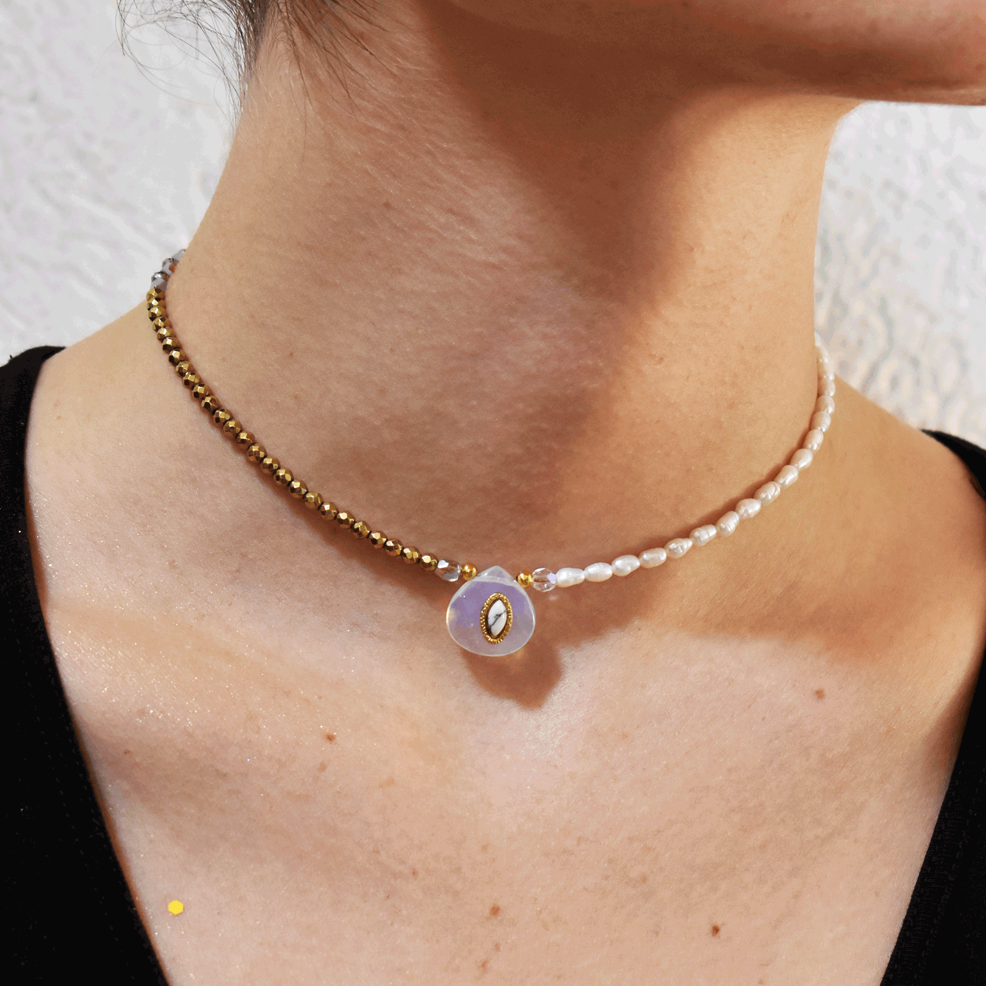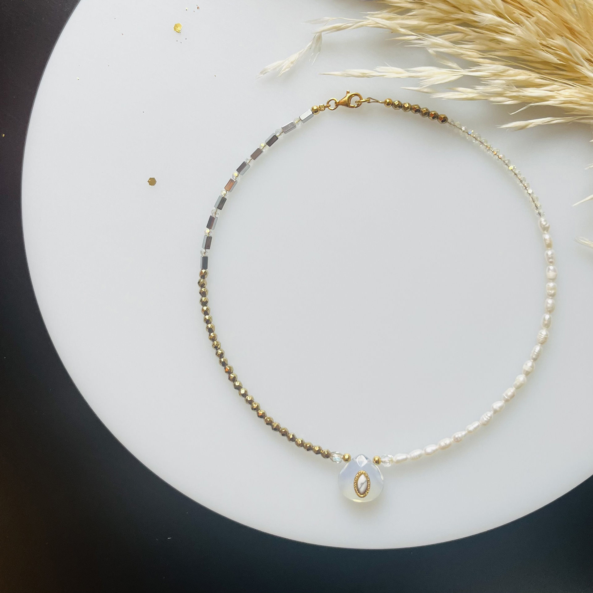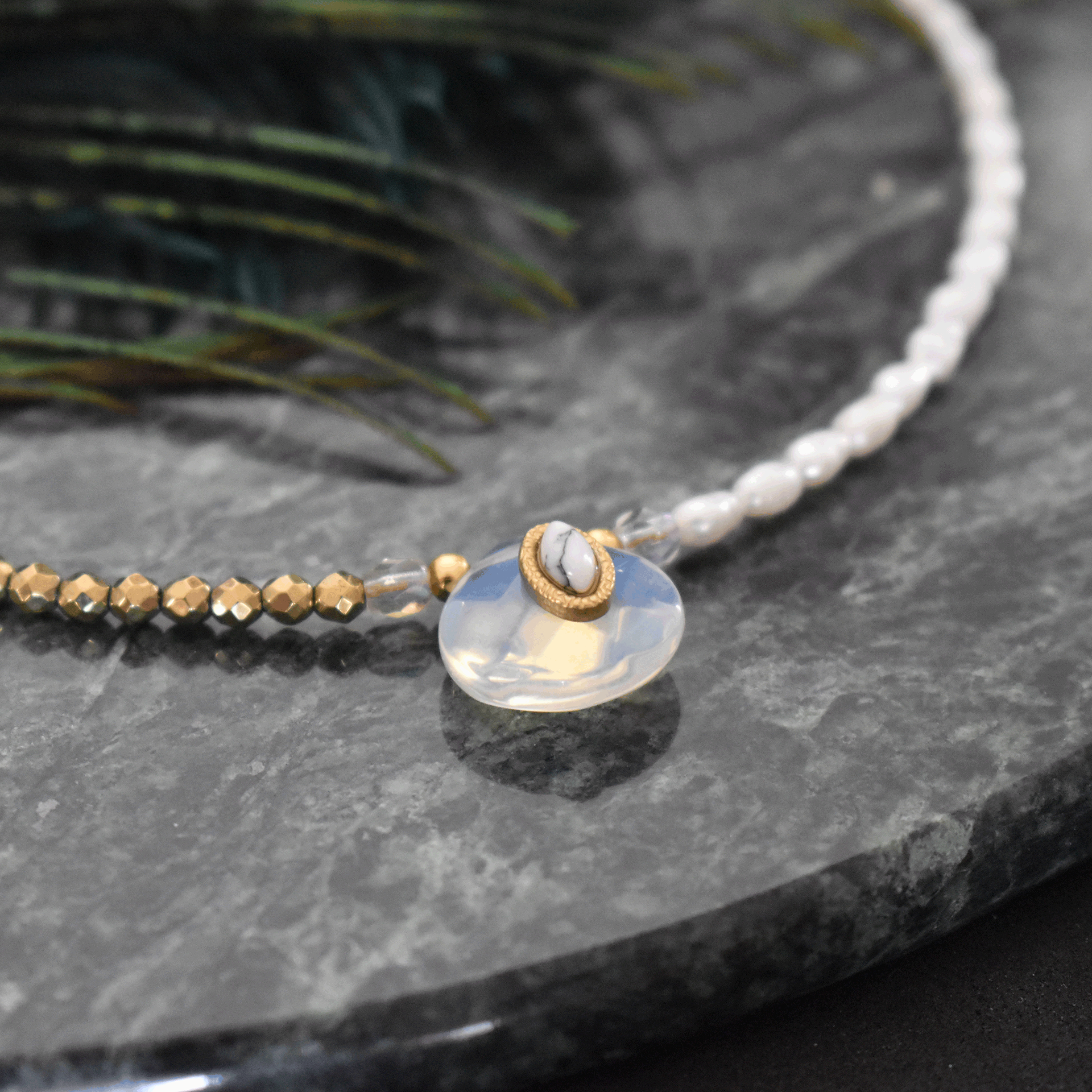 Le médaillon goutte en pierre de lune surmonté d'une howlite est associée à un rang raffiné de perles de culture naturelles et de sublimes pierres semi-précieuses. L'aura de Freya irradie dans cette composition originale.