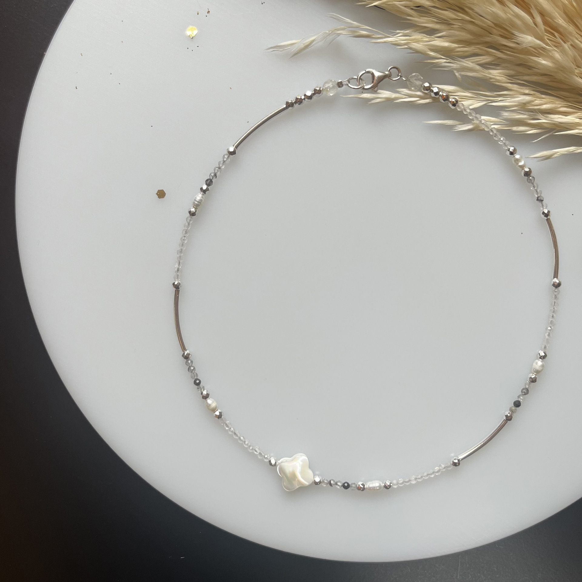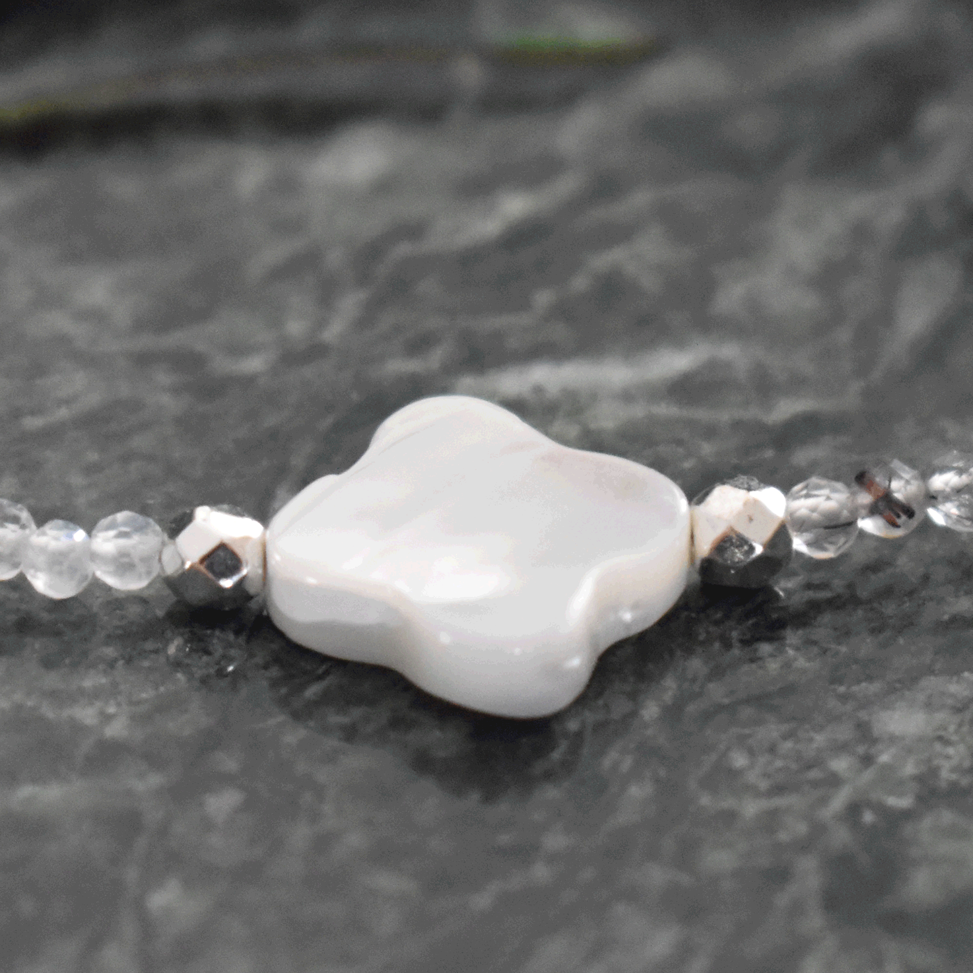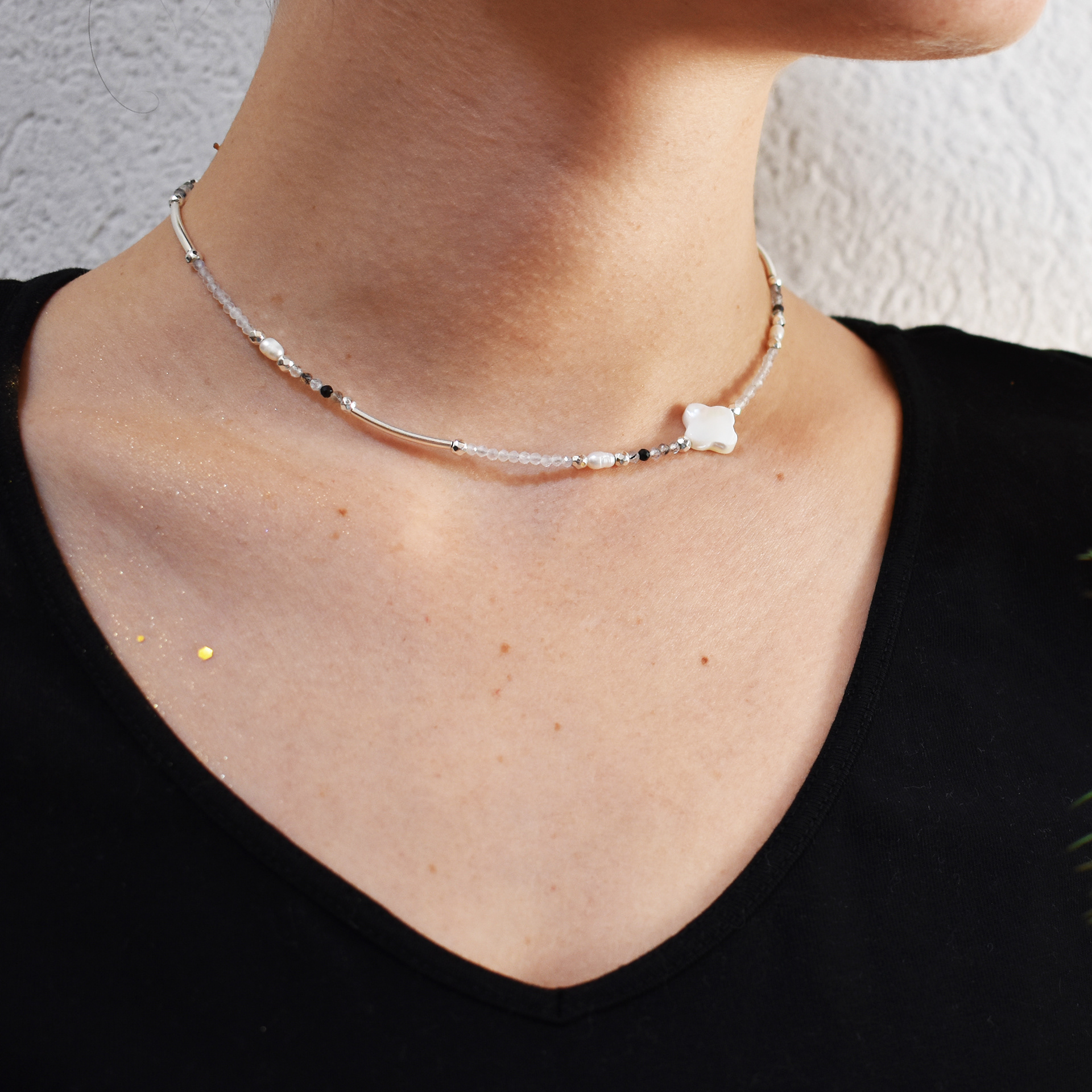 Des éléments en argent 925 qui se joignent à de magnifiques pierres semi-précieuses et un médaillon en nacre véritable. Cette composition toute en finesse, est la touche de lumière indispensable à chacune de vos tenues.