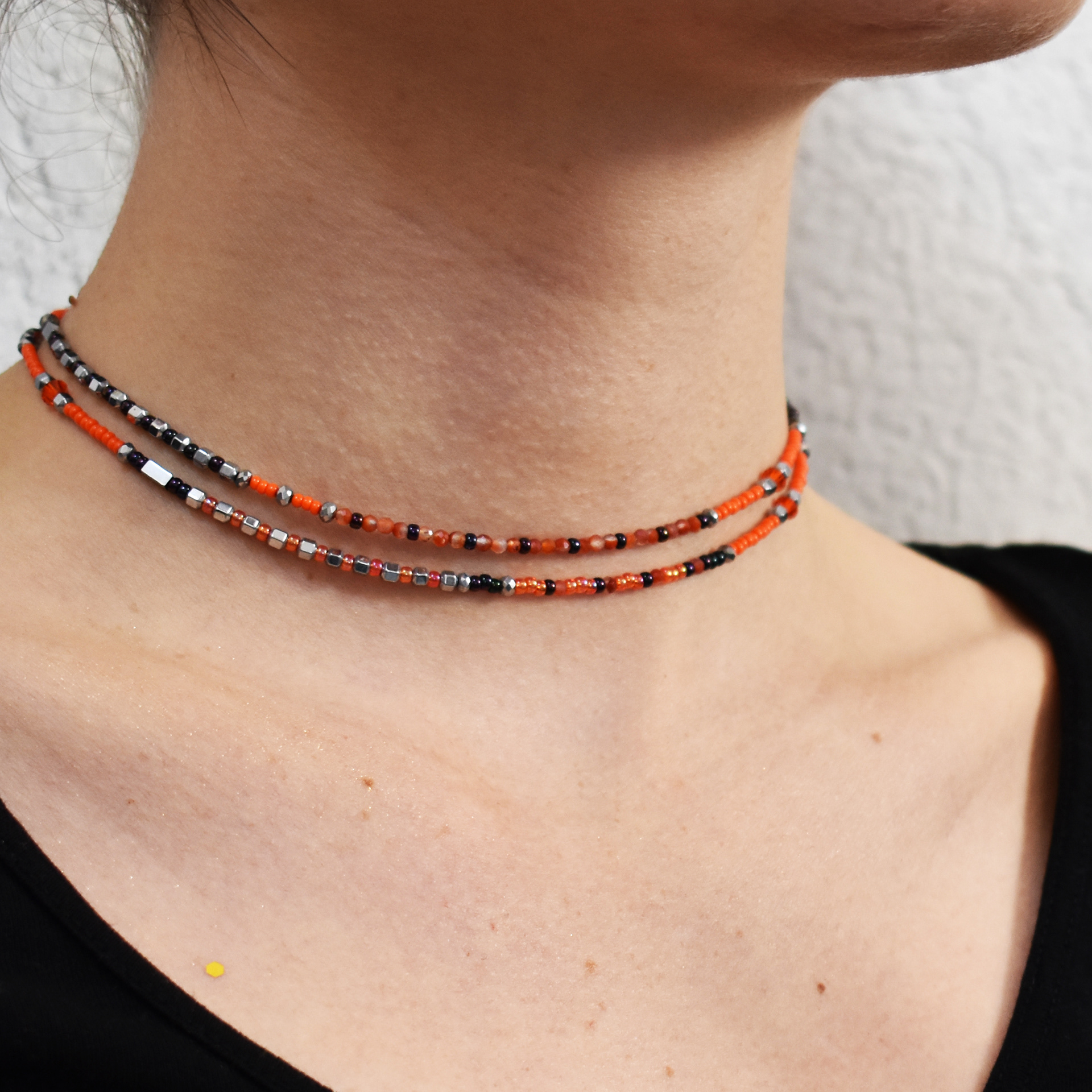 Équilibre entre couleur vibrante et reflets chatoyants, Léda se compose de deux rangs de perles en verre Miyuki et hématites naturelles.