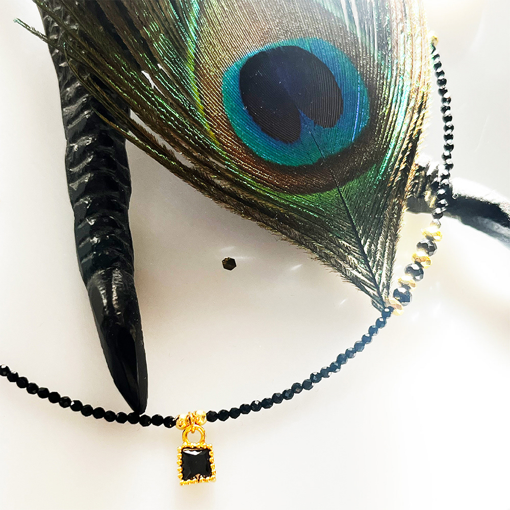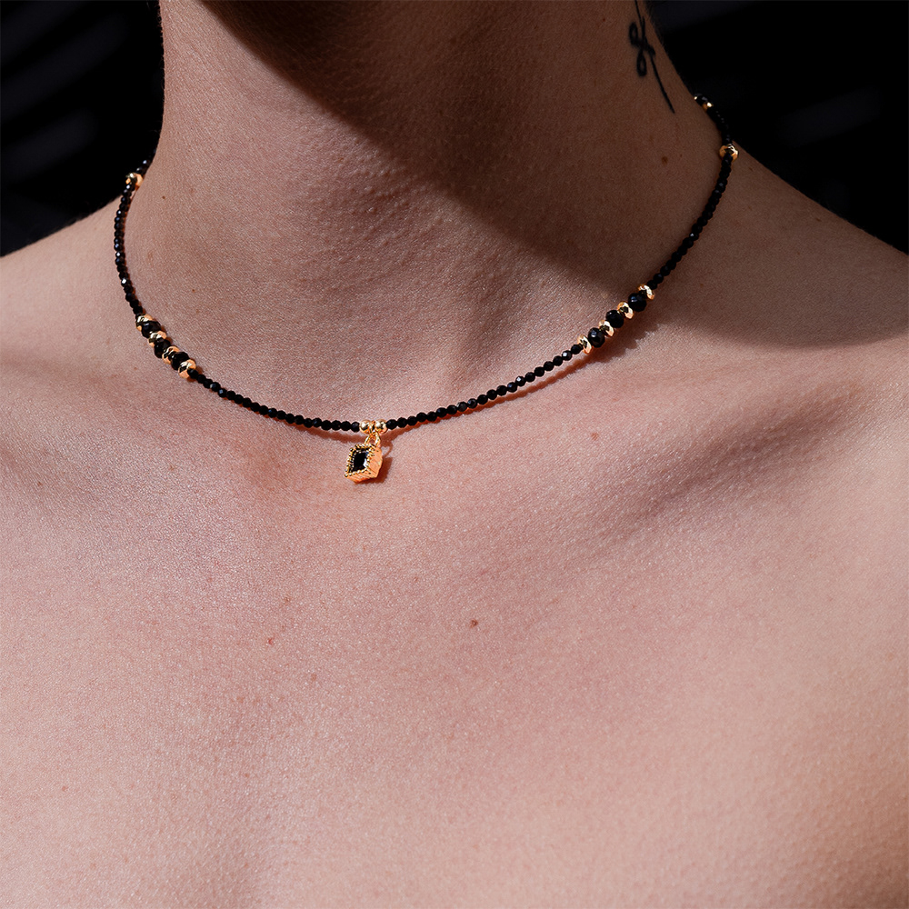 Archétype de l'ombre et de la lumière, Nyx s'anime grâce à l'association d'authentiques et ravissantes perles de spinelle et d'un pendentif de forme carrée, en cristal noir.
