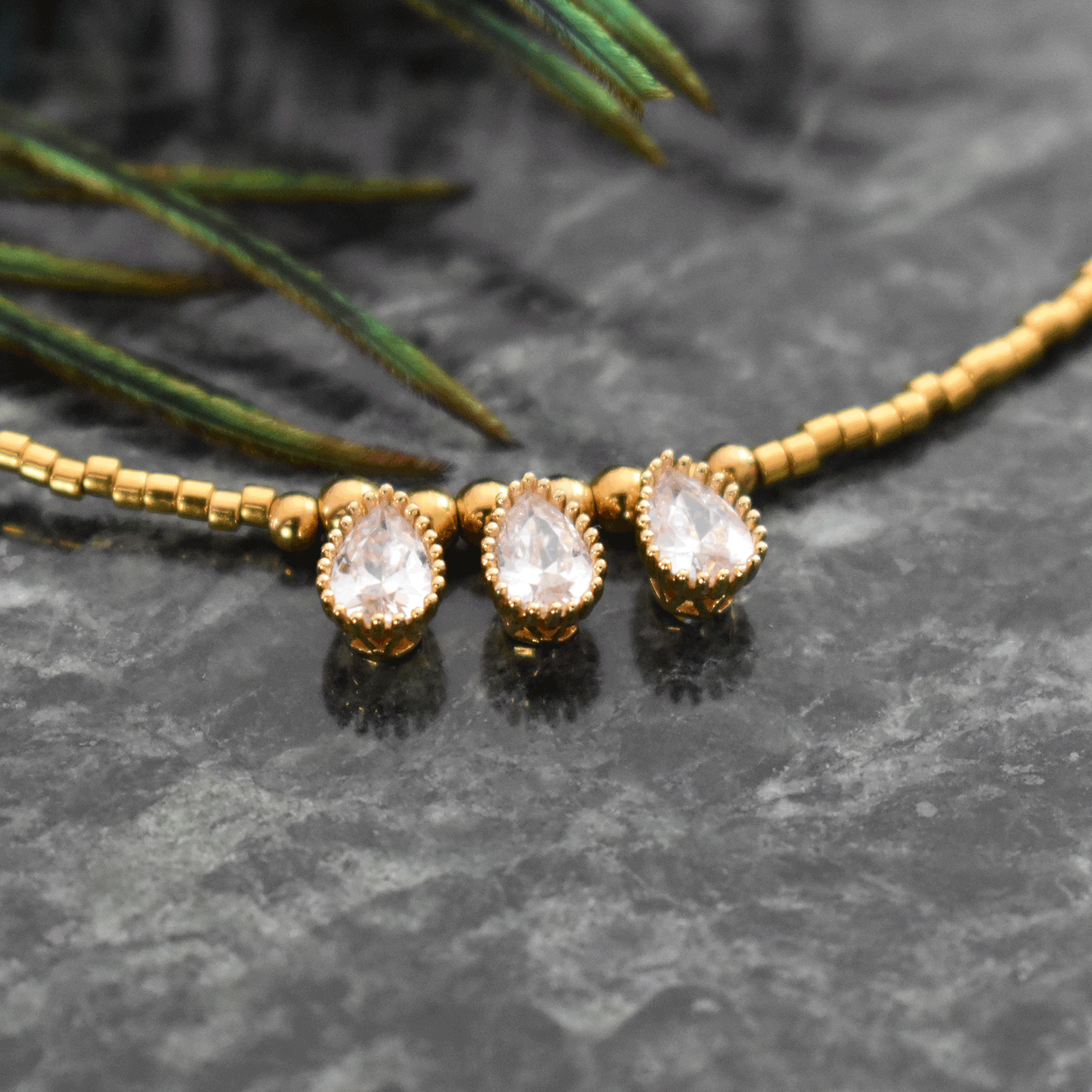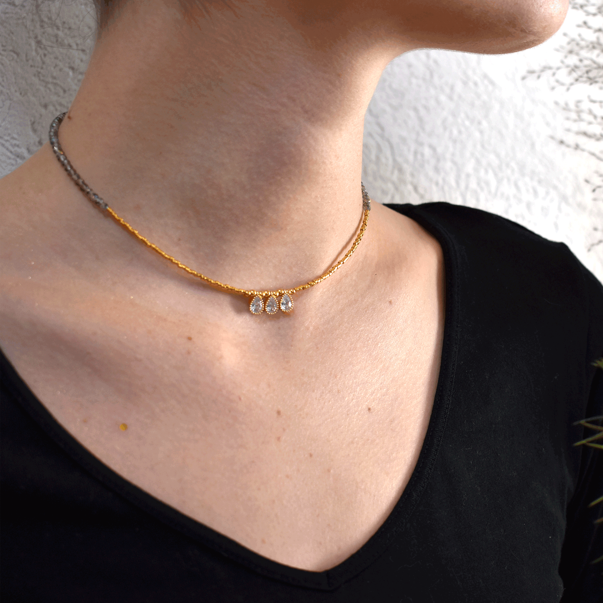 Une poétique triade de cristaux orne cette pièce, toute en finesse ! Le cristal irisé gris, de délicates petites perles Miyuki dorées viennent compléter la composition.