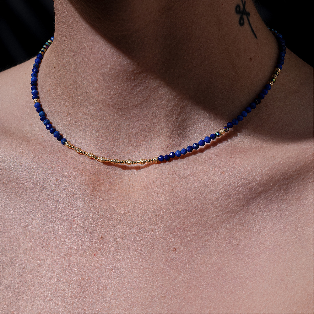 La joyeuse et florissante Thália se pare de ses plus belles perles en lapis lazuli facetté, associées à de pétillantes petites merveilles en argent 925, plaqué or 18 carats.